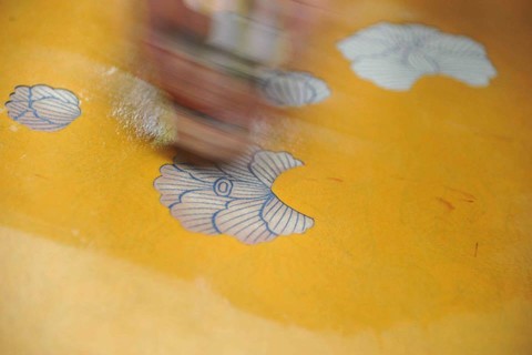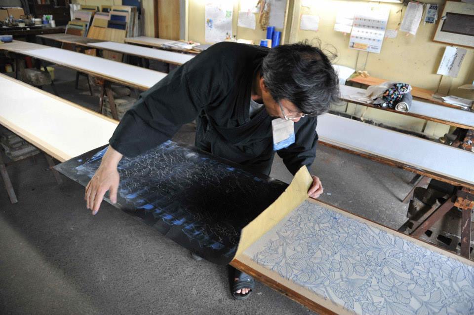 染料を直接丸刷毛で型の上から摺り込む
